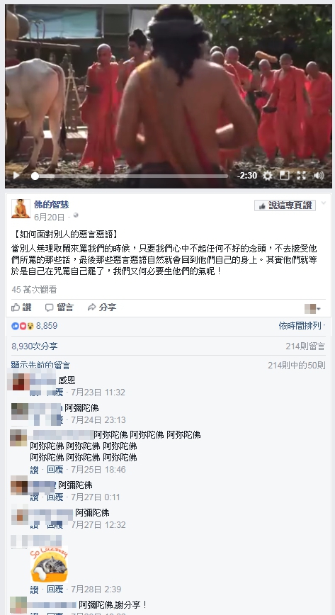 由於信徒供養勞斯萊斯的事件,針對妙禪的爆料與負面評價不斷湧出,為了安穩信徒的心與彌平輿論,信徒們紛紛在臉書瘋狂分享「佛的智慧」所發佈的影片,主題是「如何面對別人的惡言惡語」。這位分局長也不例外,同樣在私人臉書上分享影片,寫下「所見所聞未必真實,但真理永恒存在。面對惡意誹謗的人,忍他、遠他、讓他、不理他,放下它,讓心自在,學習、體會、參悟、實踐佛的智慧!」