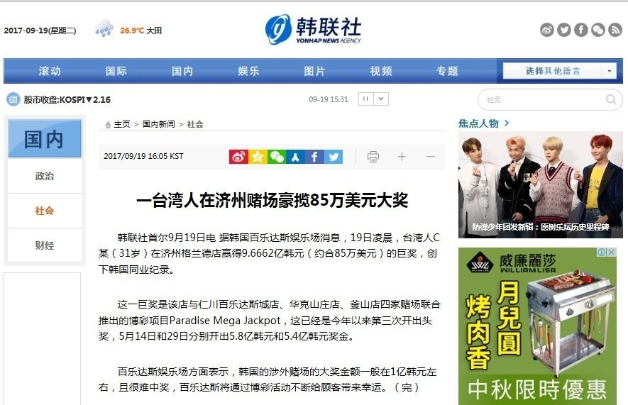 根據《韓聯社》報導,這名台灣人獲得Paradise Mega Jackpot大獎,這是由濟州格蘭德店與釜山店、仁川百樂達斯城店、華克山莊店,一共4家賭場聯合推出的博彩項目。百樂達斯娛樂場方面回應,南韓的涉外賭場的大獎金額一般在1億韓元左右,且很難中獎,百樂達斯將透過博彩活動不斷給顧客帶來幸運。