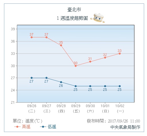 根據氣象局的一周溫度趨勢圖,估台北市周四(28日)高溫35度,周五(29日)降到30度,周六(30日)開始每天緩慢回升一度,呈現「V形曲線」。氣象局指出,下周日、一(1日、2日)風場逐漸轉為偏東風,花東地區仍有局部短暫雨,午後中南部地區及其他山區有局部雷陣雨,降雨量不會太多。氣溫部分,北部及東半部高溫約33℃上下,夜間清晨約25℃,屬於白天稍熱而夜晚舒適的型態,而中南部地區高溫約34、35℃,感受仍相對悶熱。