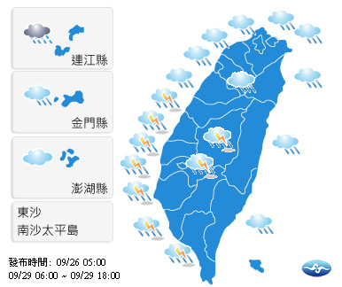 不過周四(28日)晚上起入秋首波鋒面通過及東北風增強,高溫略微下滑,午後西半部及山區有雷陣雨,除了氣溫稍降外,將轉為有短暫雨,中南部天氣則變化不大。氣象局還預測,周五(29日)受東北風影響,迎風面的北部及東半部地區有局部短暫雨,因冷空氣不強,北部及東半部的高溫約30至32℃,相較前幾天高溫大約下降4℃左右,夜間清晨約25、26℃,感受舒適,至於中南部則仍維持多雲到晴、白天悶熱而夜晚舒適的天氣型態,午後有些許雷陣雨。