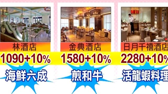 主打美食NO1「焦鹽紅蝦」,油炸過後倒在餐檯,光看色澤紅通通就令人口水直流,想吃幾隻全都自己夾,這還不夠看,多國料理,特色主打。但不便宜,假日午晚餐破千元,林酒店主打新鮮海產超過六成,金典酒店煎和牛吃得下幾片,廚師現場料理,日月千禧酒店,要付至少二張大鈔,誇口想得到的活龍蝦料理他們都有。