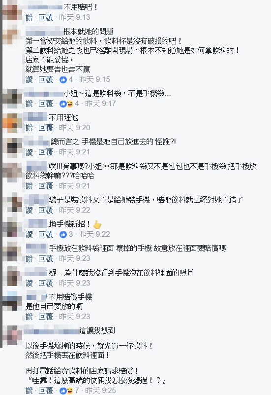 對於原po的疑惑,大批網友們紛紛留言砲轟女客人,「根本就她的問題,第一當初交給她的飲料,飲料杯是沒有破損的吧!第二飲料給她之後也已經離開現場,根本不知道她是如何拿飲料的!店家不能妥協,就算她要告也告不贏」、「有事嗎?小姐,那是飲料袋又不是包包也不是手機袋,把手機放飲料袋幹嘛?」、「 當然不用賠阿,飲料好好的拿絕對不會破掉,會破掉是人為因素,為什麼要賠?!」、「首先要釐清一件事,手機是誰放進袋子裡的?就要負所有責任」、「基本上櫃檯上方會有攝影機, 應該可以拍到出杯時杯子的完整性!支持店家調出畫面,打臉奧客!」另外也有網友酸女客人「想換i8是嗎」,女客人無理的舉動引發網友一致撻伐,目前當事店家低調不願意受訪,僅表示已賠償對方一杯飲料,至於手機是否需賠償,雙方還在協調中。