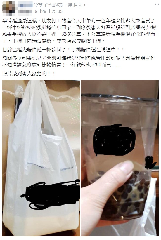 爆怨公社》社團中表示,朋友在手搖飲料店打工,29日中午時有一名年輕的女客人到店裡消費,購買一杯中杯飲料後便搭乘公車返家。不久後飲料店接到了這名女客人的投訴電話,她表示當時她將iPhone手機放入飲料袋裡,卻在下公車時察覺到飲料店所使用的塑膠杯破裂,而放在袋中的手機也淪陷,經過檢查之後手機呈現無法開機的慘況,因此向店家要求手機賠償。