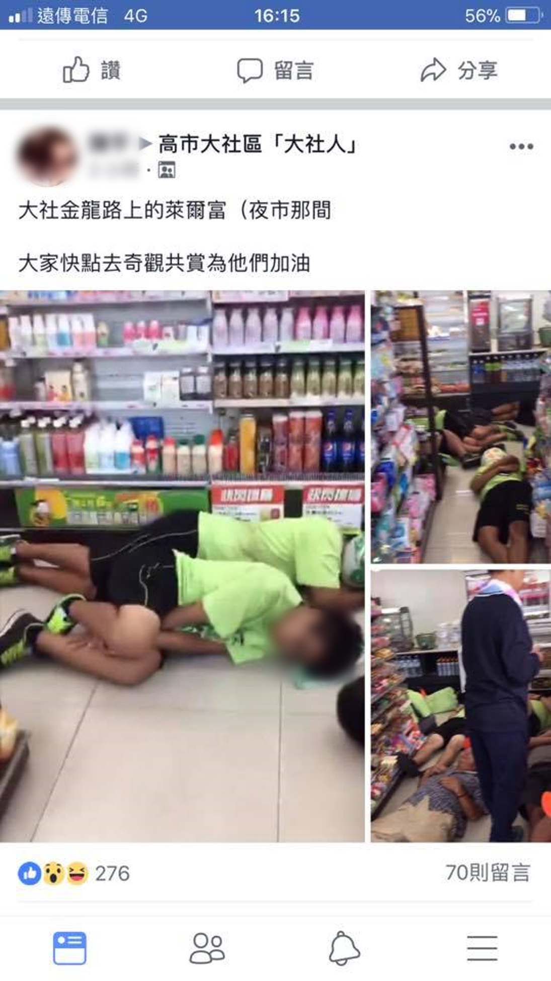 廟會活動,席地而坐的人疑似是陣頭團體。還有網友分享在高雄大社的超商,甚至有一群人睡倒在地。