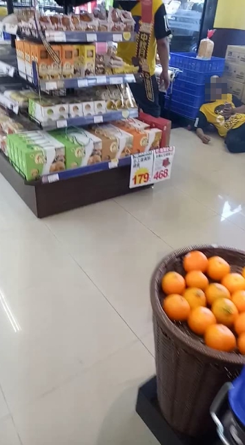 陣頭團體的人,分散坐在賣場各地,有人直接席地而坐,擋在冰箱門前滑手機,或靠著尚未上架的貨物休息,甚至有人疑似太累了,直接躺平靠在一旁友人的腳邊。