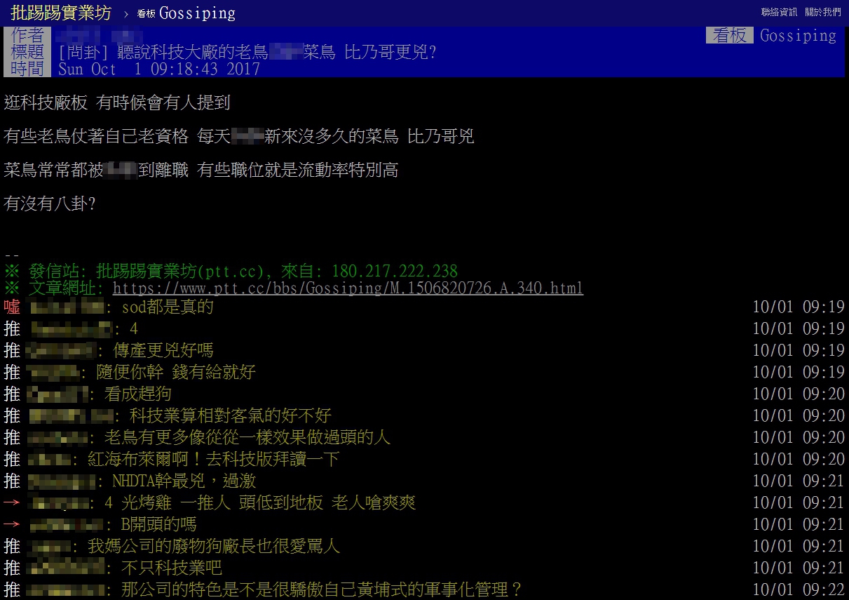 原PO表示,「逛科技廠板,有時候會有人提到,有些老鳥仗著自己老資格,每天XX新來沒多久的菜鳥,比乃哥兇,菜鳥常常都被XX到離職,有些職位就是流動率特別高……」