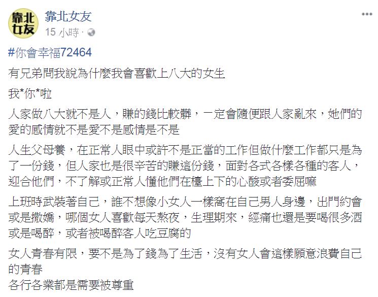 一名網友在臉書《靠北女友》表示,有兄弟問他「為什麼我會喜歡上八大的女生?」這個問題讓他為女友打抱不平,「人家做八大就不是人,賺的錢比較髒,一定會隨便跟人家亂來,她們的愛、的感情就不是愛、不是感情是不是?」且似乎有感而發,連髒話都飆出來了。