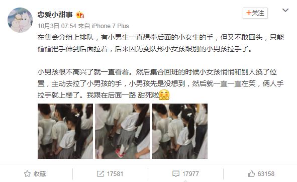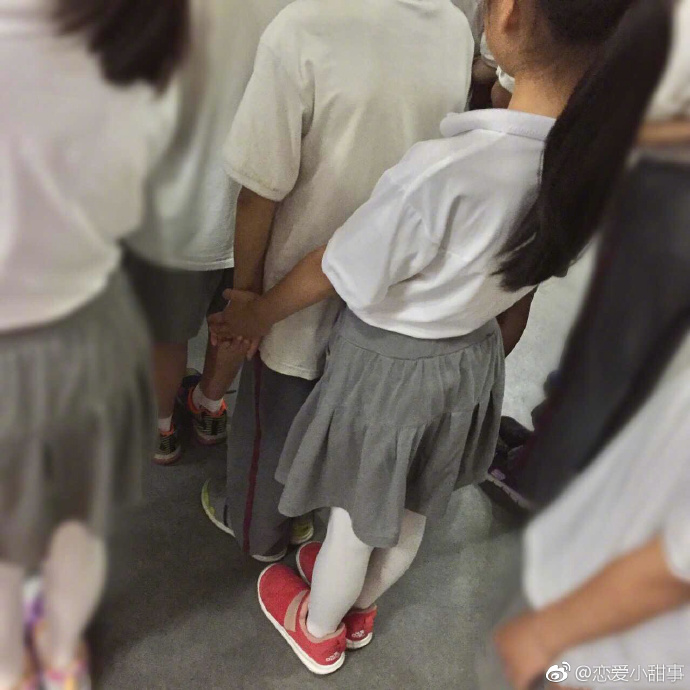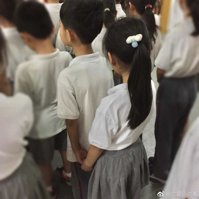 每個人在小的時候,可能都有過一段純純的愛戀,小男生小女生開心地牽著手,手心暖暖的,心頭也暖暖的。最近,微博瘋傳一組可愛的照片,男孩在集會上牽起後面女同學的手,後來換位置時,女孩也主動牽了男孩的手,2個孩子笑嘻嘻的,讓不少網友看了都覺得好幸福,直呼「甜死啦!」