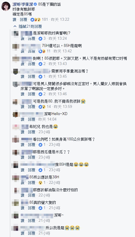 就連知名實況主「潔哥」也留言說「85是下圍的話,好像有點胖耶,確定是85嗎?」網友都笑翻回應「75H還可以,85H是龍啊」、「對啊!85很肥耶。又胖又肥,男人不是有奶都有胃口好嗎」、「那是西瓜還是木瓜?」、「85真的蠻大隻的」、「85所以應該是38H」。