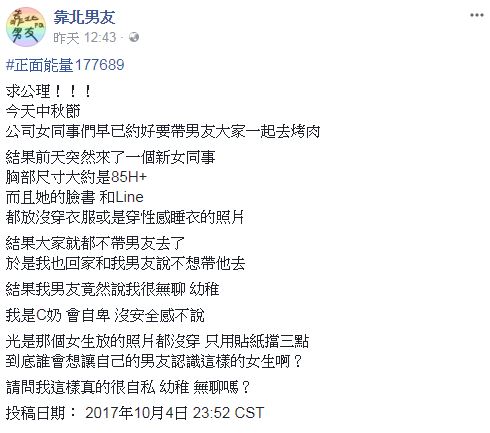 每到一年一度的中秋佳節,大家肯定會找個時間回家和家人團圓吃個飯,或是廣邀三五好友出來烤肉賞月。可是有網友指出,今年中秋節同事們約好要帶自己的男友出來一起烤肉,沒想到前幾天突然殺出一個新來的女同事,胸部不但擁有傲人的85H+,臉書還常放沒穿衣服的性感照片,於是大家就默默地決定不帶男友去了,結果原PO就被男友罵「幼稚」,讓她聽了很不是滋味!