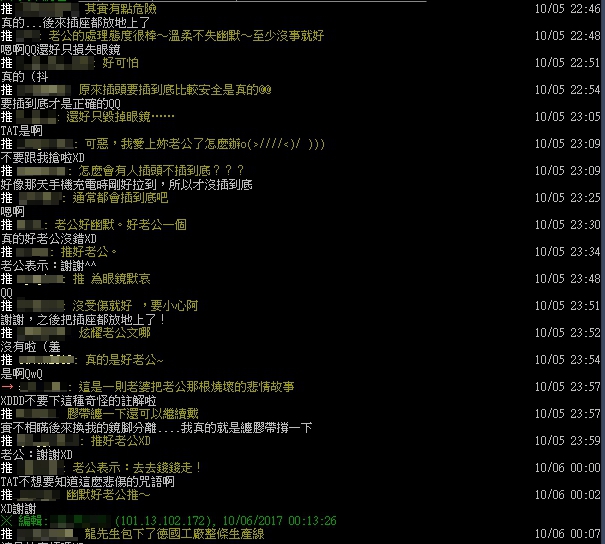 而親友們得知後,也紛紛表示,從沒看過眼鏡是如此「繽紛絢爛死去的」。女網友將此事PO上網,此文一出隨即引起許多網友熱議,「其實有點危險」、「原來插頭要插到底比較安全是真的」、「真的該害怕,隨時會有生命危險啊」,但也有女網友對這名幽默老公告白,「可惡,我愛上妳老公了!怎麼辦」、「推老公脾氣好又幽默」、「假笨文真炫耀文,老公真棒」、「說不定老公不是刻意想的梗,是他真的這麼覺得啊」。