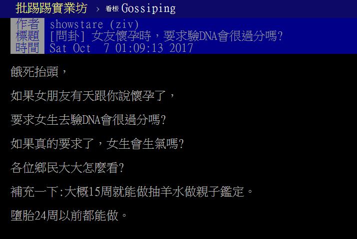 日前網友們在PTT上討論,「女友懷孕時,要求驗DNA會很過分嗎?」貼文引起熱議,有人認為如果真的驗了「感情會變不好」、「驗就是不信任!」、「這樣問就可以準備分手惹」、「會生氣,而且會感覺很不被受信任」、「這樣很不尊重女生耶」、「如果我被這樣問,我寧願把小孩拿掉分手!」