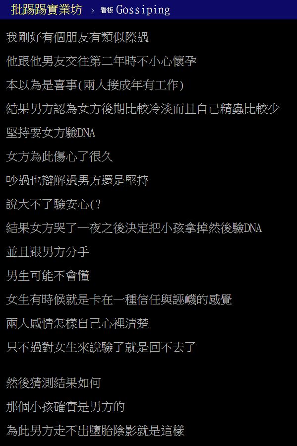 網友表示,「男生可能不會懂,女生有時候就是卡在一種信任與誣衊的感覺,兩人感情怎樣自己心裡清楚,只不過對女生來說,驗了就是回不去了」結果最後驗完DNA,孩子確實是男方的,但男方從此走不出墮胎陰影。不過不少網友似乎認為女方做法太極端,「女方有病吧」、「殺人兇手是哪個母的好嗎,關男方屁事?」