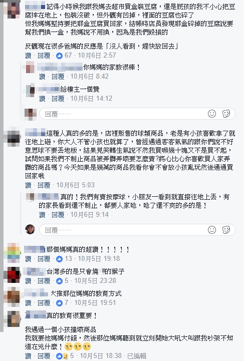 貼文引發熱議,文中媽媽的做法更是讓人大讚「身教大於言教!」還有網友分享了自身的故事,「小時候我跟我媽去超市買盒裝豆腐,我不小心把豆腐摔在地上,我媽媽堅持要把那盒豆腐買回家,結帳時店員發現豆腐碎掉,說要幫忙換一盒,但我媽說不用換,因為是我們毀損的,反觀現在很多爸媽的反應是『沒人看到,趕快放回去』」。