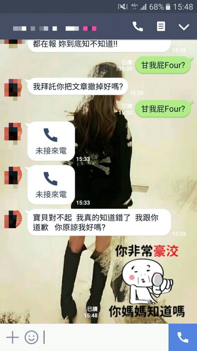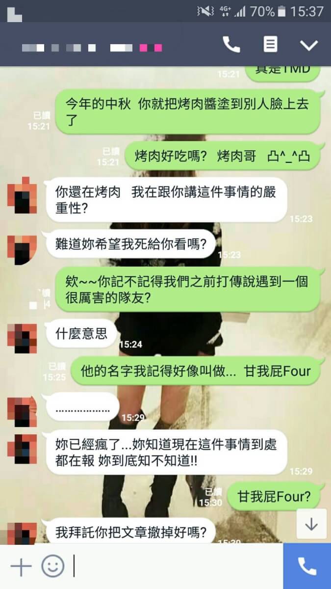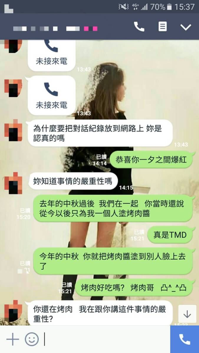 Line對話紀錄中,男友連打2通電話,但女網友並沒有接通,男友只好傳訊息質問,「為什麼要把對話紀錄放到網路上,妳是認真的嗎?」、「妳知道事情的嚴重性嗎?」、「妳知道現在這件事到處都在報」。但女網友霸氣回嗆,「甘我屁Four(事)」,並揶揄男友「恭喜你一夕之間爆紅,烤肉哥」。