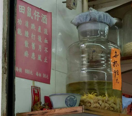 一名網友在臉書《巴打絲打 Facebook Club》分享一張照片,只見這瓶藥酒裡裝著黃褐色的液體,還有一隻隻白色的小田鼠,有一些沉在瓶底,有幾隻則是漂浮在上面。據原PO所說,阿嬤把這瓶「田鼠仔藥酒」當成傳家之寶,可內服也能外敷,不論是驅除風濕、坐月子養身、止血,甚至跌打損傷都能治療。