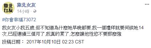 網友在臉書粉專《靠北女友》表示,現在和一個小他5歲的女友交往當中,但不知怎麼搞的,對方早上和晚上都會要求嘿咻,短短一個禮拜就至少要伺候14次,而且已經連續3個月了,實在沒那個體力和精力滿足女友,崩潰大呼「我真的累了,怎麼讓她性慾不要那麼強?」