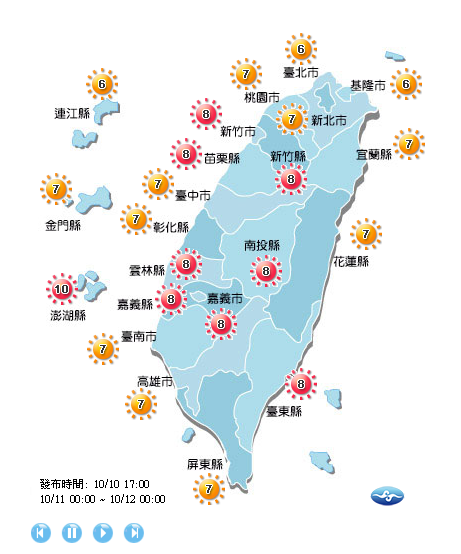 ▼明天10月11日全台紫外線預報。圖/中央氣象局