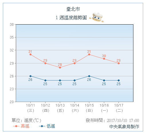 ▼未來一周台北市溫溫度趨勢圖。圖/中央氣象局