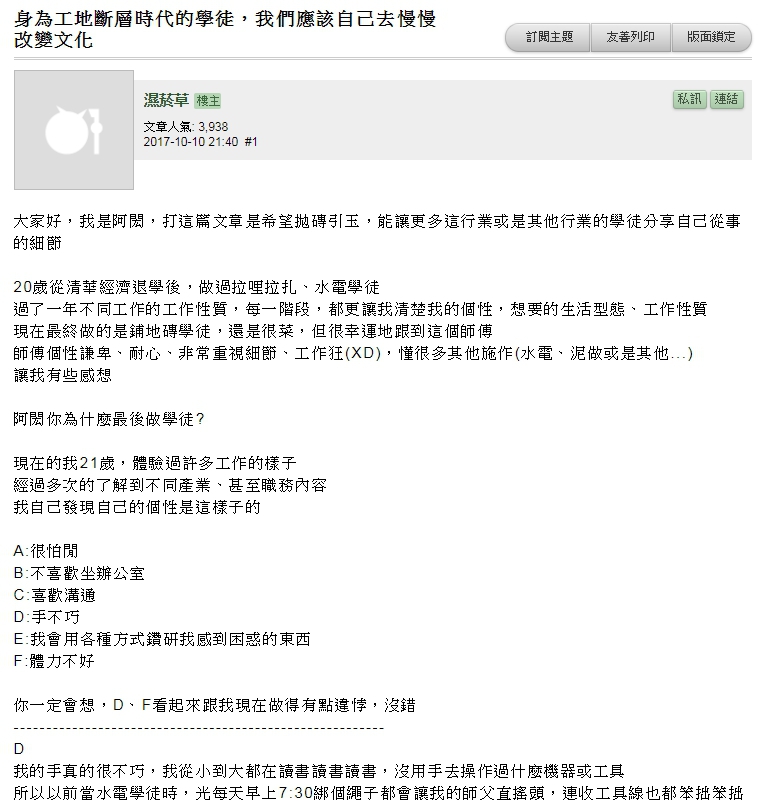 mobile01》發文表示,現年21歲的他,從清大經濟退學後,嘗試了許多工作,連水電學徒也做過,「過了一年不同工作的工作性質,每一階段,都更讓我清楚我的個性,想要的生活型態、工作性質。」直到現在,他最終做的是鋪地磚學徒,也很幸運地遇到好師傅,從菜鳥跟著慢慢學習。