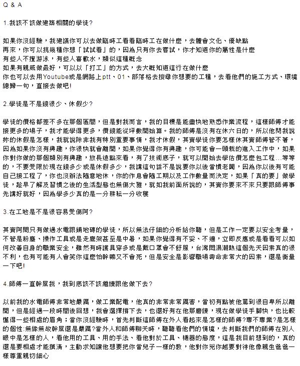 不過,肯定會有不少人問說「我該不該做建築相關的學徒?」、「學徒是不是錢很少、休假少?」、「在工地是不是很容易受傷阿?」、「師傅一直譙我,我到底該不該繼續跟他做下去?」等等,而原PO認為,該不該做要先「試試看」才會知道結果,每個工作都是一分耕耘一分收穫,所以「年輕一代的學徒們,我們需要開始慢慢地建立原則、文化,雖然工作性質會很長一段時間被其他人以特殊角度看待,但是這不能阻止我們建立一套更與時俱進的標準。」