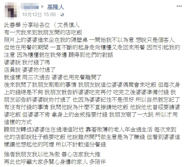 一名網友在臉書社團「基隆人」貼文表示,自己某天到朋友開設的店用餐,一位坐在隔壁的老婆婆在用餐時不斷走到櫃檯前方,與店員說了一些話,又走回位置用餐,總共兩三次,讓他心生好奇,於是聽了婆婆與店員的對話,原來婆婆一直不斷地問「我付錢了嗎」,店員則回應「婆婆,妳付過了。」