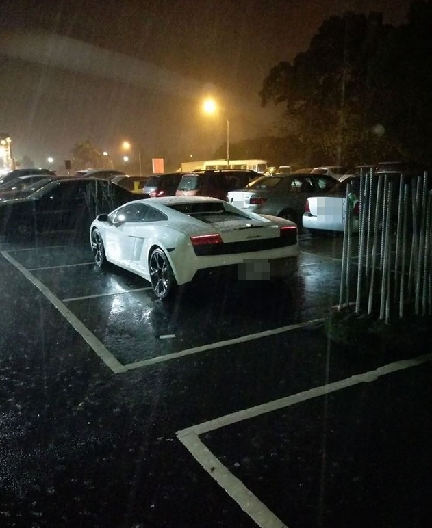 停車場不收費,從他PO的照片可以看到,後方的停車位幾乎都停滿了,每台車子也都按規矩停在停車格裡,唯獨一輛白色的藍寶堅尼的停法最突兀,藍寶堅尼完全無視地上畫的線,直接橫停「一車占三格」停車位,當場讓這名網友超傻眼,並批說「有錢就是任性」。