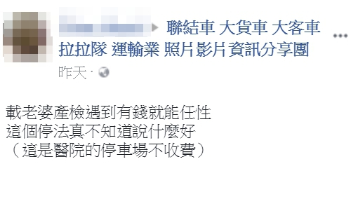 這名網友在臉書「聯結車 大貨車 大客車 拉拉隊 運輸業 照片影片資訊分享團」爆料,他指出,自己當天要帶老婆到桃園楊梅的醫院產檢,當時正下著大雨,由於院方的