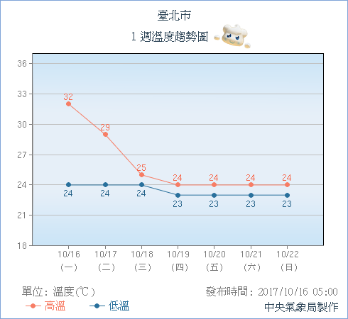 至於溫度方面,受東北風影響,桃園以北及宜花氣溫又稍降,高溫約24至30度,感受舒適,其他地區影響小,高溫約30至34度;至於各地低溫整週皆在23至26度左右,早晚稍涼。