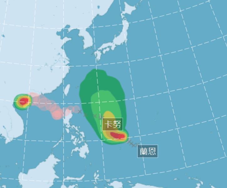 氣象局指出,第20號颱風卡努今晨已減弱為輕度颱風,目前中心位置在雷州半島一帶,已影響到兩廣及海南島一帶的天氣;不過位於菲律賓東方海面的熱帶性低氣壓,也在今晨2點發展為21號颱風「蘭恩」,其中心位置距離鵝鑾鼻東南方約2100公里,目前以每小時11轉14公里的速度向西北移動。
