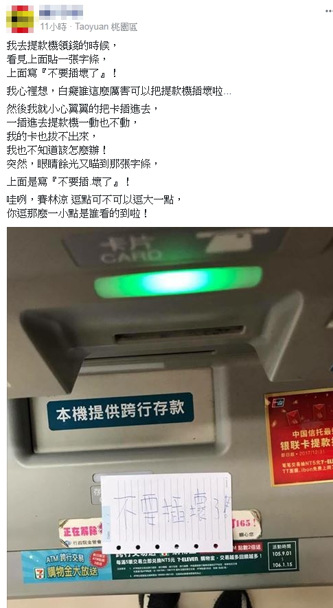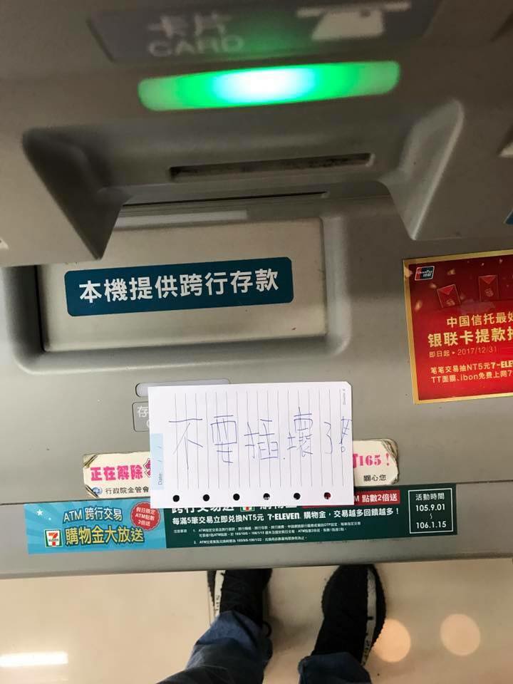 該名網友在「爆廢公社」表示,昨(23)日他去小七領錢時,看到提款機上貼了一張紙條,寫著「不要插壞了」,當下原PO不以為意,心裡還想到底誰這麼厲害會把提款卡插壞,對店員的「溫馨小叮嚀」視而不見,沒想到當他把卡片插入後,悲劇就發生了。