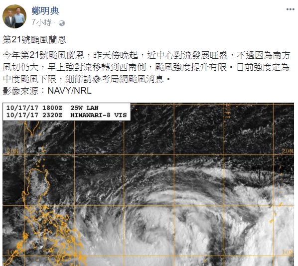 中央氣象局科技中心主任鄭明典下午在臉書表示,蘭恩颱風從昨天傍晚,近中心的對流發展旺盛,但南方風切仍強,早上強對流移轉到西南側,颱風強度提升有限,目前強度定為中度颱風下限。