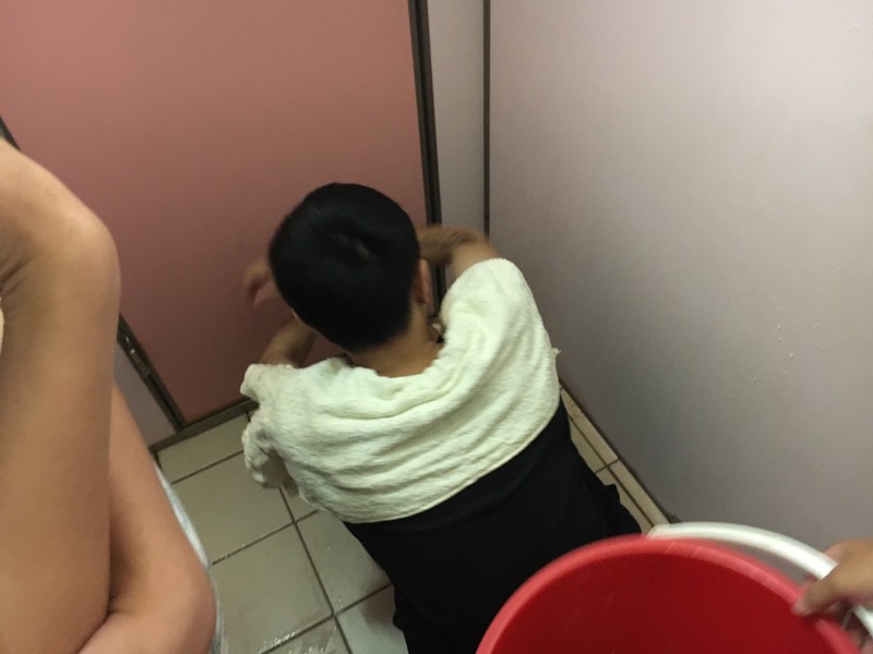 不過幸運的是,剛好有2個室友以前是做美髮的,所以他們突發奇想,合力自製「衛浴設備」,於是4個大男人,穿著四角褲擠進個人淋浴間,採取「專業分工」的方式進行洗頭任務,一個人拿著水桶充當沖水台,一人負責洗,而剩下一人則用手機記錄精彩時刻,而且洗完還有舒服的吹髮服務!