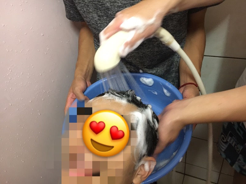洗頭小隊」,幫他洗得清潔溜溜,而且過程中雖然笑料不斷,但不少人看了,都直呼實在「太溫馨」。