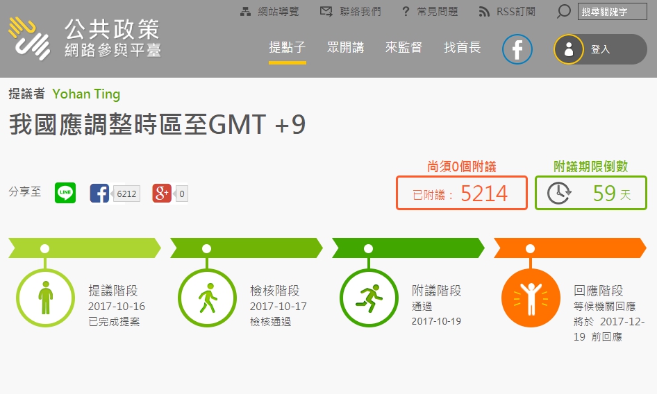 提案人還提到,若台灣所處的時區提前1個小時,在冬季下班就不會那麼暗,夏季也可以充分地使用陽光。沒想到,16日才提案,17日檢核通過,19日便迅速通過5000個附議門檻,主管機關得在12月19日前做出回應。