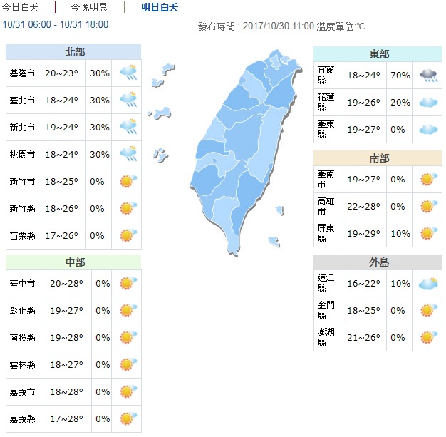 ▼明天10月31日全台天氣概況。圖/中央氣象局
