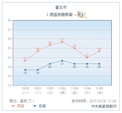 ▼未來一周台北市溫度趨勢圖。圖/中央氣象局