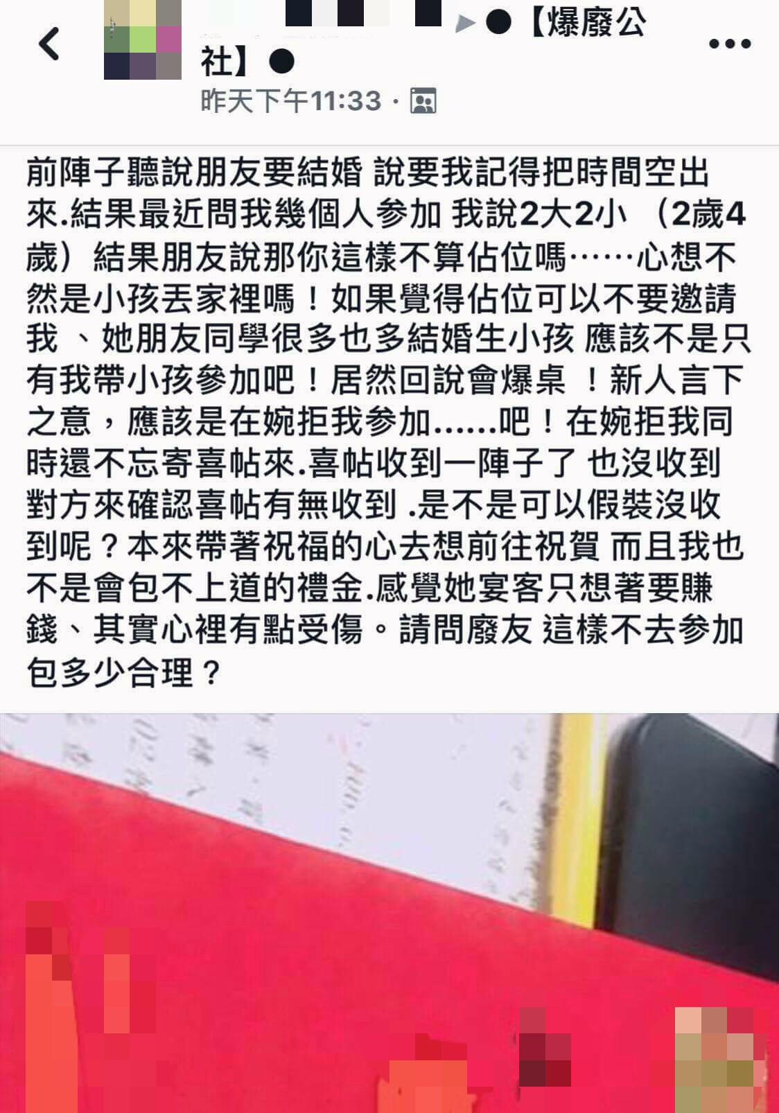 「爆料公社」臉書分享,一名女網友收到喜帖,滿心期待赴宴給朋友祝福,卻因為要帶2個孩子去,被朋友嫌棄「佔位」。女網友心寒表示,之前