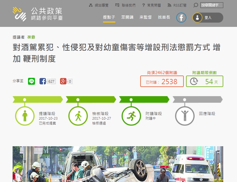 提案PO網後,立刻引起網友們的熱烈討論,目前已有近2600位的網友支持,若未來達到5000人的附議門檻後,主管機關必須在2個月內回應「鞭刑」一案的採用情形。