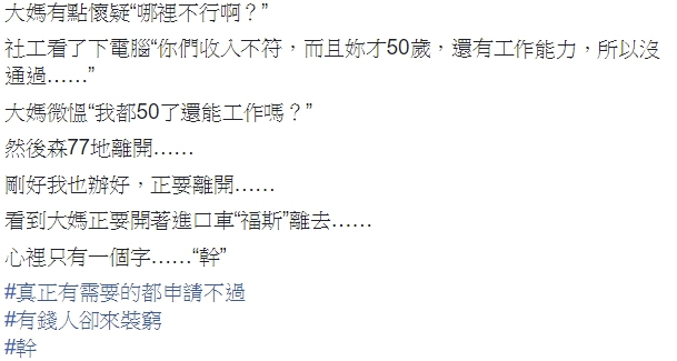 沒想到,大媽卻開始感到不高興,問「我都50了還能工作嗎」,說完,就怒氣沖沖地離開。原PO當時因為正好辦完手續,於是也跟著離開,卻看見大媽「開著進口車福斯」匆匆離去,他感到相當傻眼,頓時在心中怒罵了一下。文末,他還無奈表示「真正有需要的都申請不過」、「有錢人卻來裝窮」。