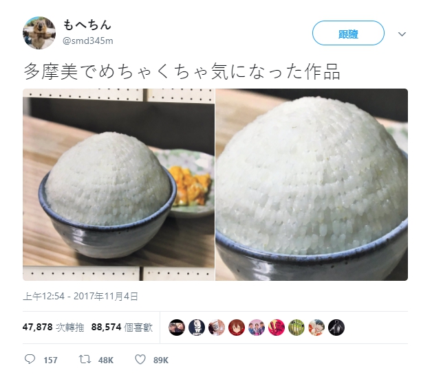 日本一名網友日前去東京多摩美術大學參觀展覽時,拍下了一張作品分享到網路,這碗「整齊的白飯」在短短2天內就引來近5萬人轉發,因為這碗一粒粒米垂直排成的白飯,讓人看了有種說不出的焦慮感,有