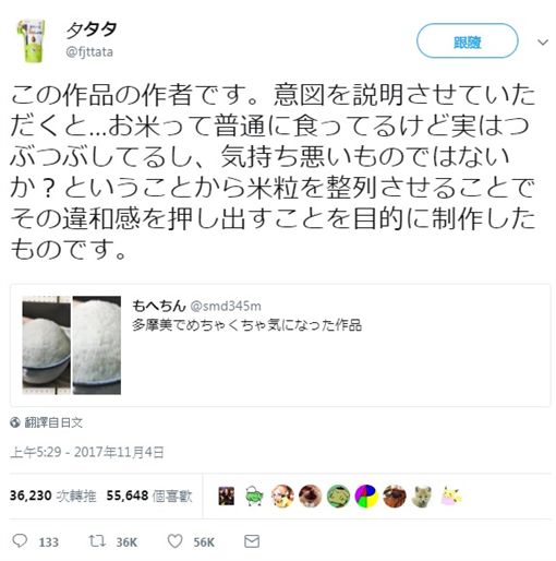 密集恐懼症的人更無法直視,因為製作起來實在太精細又費工,有網友懷疑那碗飯其實是用「畫」的,但作品作者隨後也出面回應「這是一碗貨真價實的白飯,想讓大家感受到反常的異樣感。」