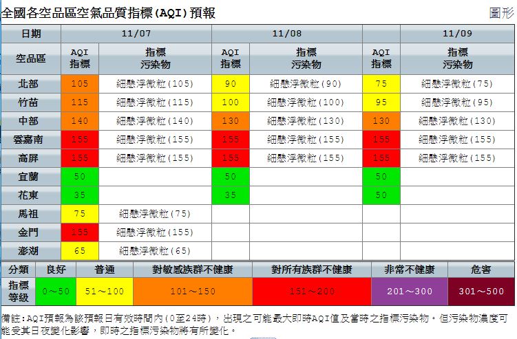 環保署指出,空氣品質拉警報主要是受到大氣擴散條件不佳影響,導致今(7)日高屏、雲嘉南及金門地區空氣品質達到「對所有族群不健康」的紅色等級,中部以北地區為「對敏感族群不健康」橘色等級,其他地區則為良好至普通等級。明後(8、9)日高屏、雲嘉南地區同樣是紅色等級,中部地區為橘色等級,其他地區為良好至普通等級,指標污染物為細懸浮微粒。