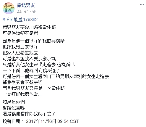 該名女網友在「靠北男友」上貼文表示,「我男朋友要參加婚禮當伴郎,可是伴娘卻不是我」,原PO指出,男友一位很要好的親戚要結婚,於是請他當伴郎,一同餐與這幸福的時刻,但因為當伴郎的話,勢必與「其他女生」擔任的伴娘手牽手進場,但這讓原PO無法接受,即使男朋友保證只是走那一段路就會馬上回到她身邊,但原PO依然覺得彆扭,「任何一個女生看到自己的男朋友牽別的女生走進去,都會生氣會不想去吧」。