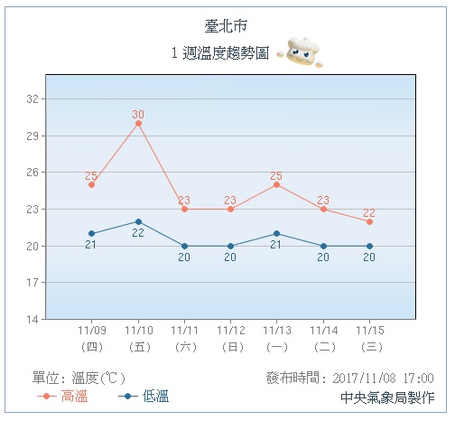 氣象局預測,明天(9日)仍受東北風影響,不過冷空氣勢力較弱,僅北部及宜蘭溫度下降至22到27℃間,其他地區溫度變化不大,降雨集中在北部及東半部,中南部仍為穩定天氣;周五(10日)是兩波東北風的空檔,北台灣溫度回升,迎風面降雨也減少。值得注意的是,周六到下周二(11日到14日)另一波東北風南下,北部、東半部降雨再增多,且這波冷空氣勢力較強,北台灣天氣轉涼、低溫下探19℃,中南部溫度也略微下降,但仍是多雲到晴天氣。
