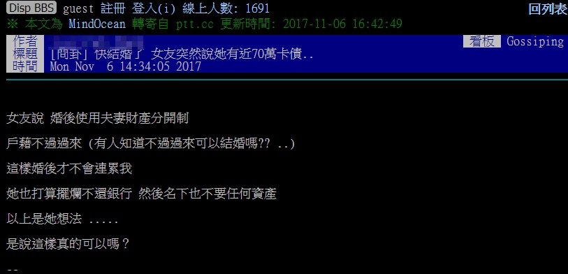一名男網友日前在《PTT》上PO文表示,自己將和女友結婚,但對方近日卻突然告知有高達70萬元的卡債,而且還「擺爛」以對,預計不還錢給銀行,名下也不要有任何資產。據原PO表示,未婚妻表明要實施「夫妻財產分開制」、戶籍不過戶,認為只要這樣做婚後就不會連累到原PO。