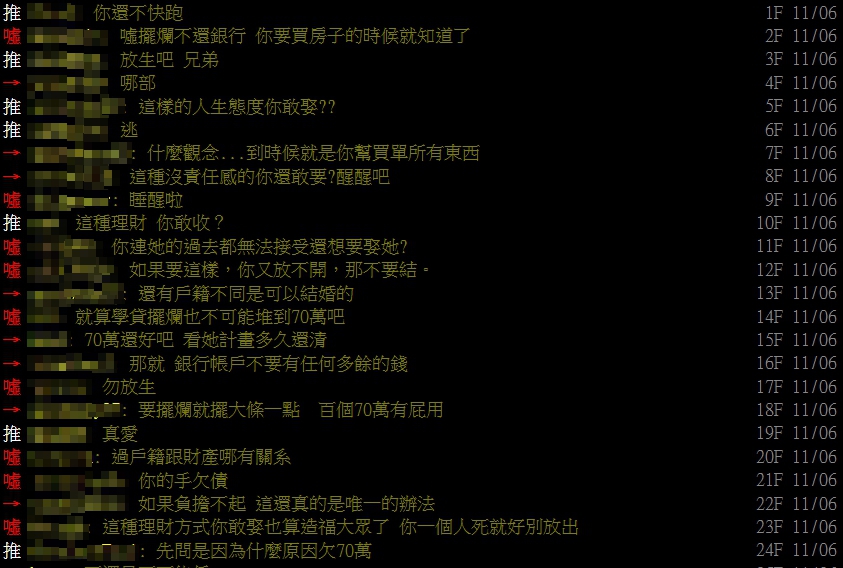 此文一出,引起網友紛紛留言,「長知識,推!另一半還是躲不掉」、「這篇正確!快結婚,別放生,功德無量啊」、「光是擺爛債務不處理這點就黑名單了」。