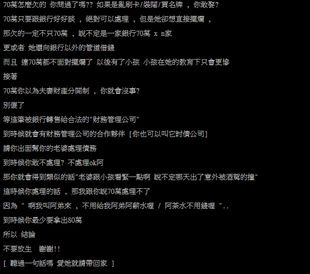 討債公司,到時候的欠債金額更可能以各種名目如:「員工錢」、「茶水錢」增加,之後要還錢就不只是70萬元的金額,但最後他話鋒一轉結論:「不要放生,謝謝!愛她,就請帶回家」。