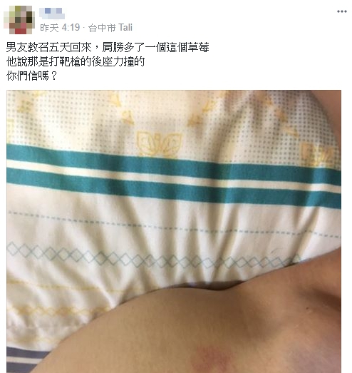 還有眼尖的網友發現除了那個「印記」外,周圍還有些微瘀青的痕跡,且從顏色來判斷不像是「草莓」,認為原PO「想太多」,應該要多體諒男友,而不是懷疑對方。