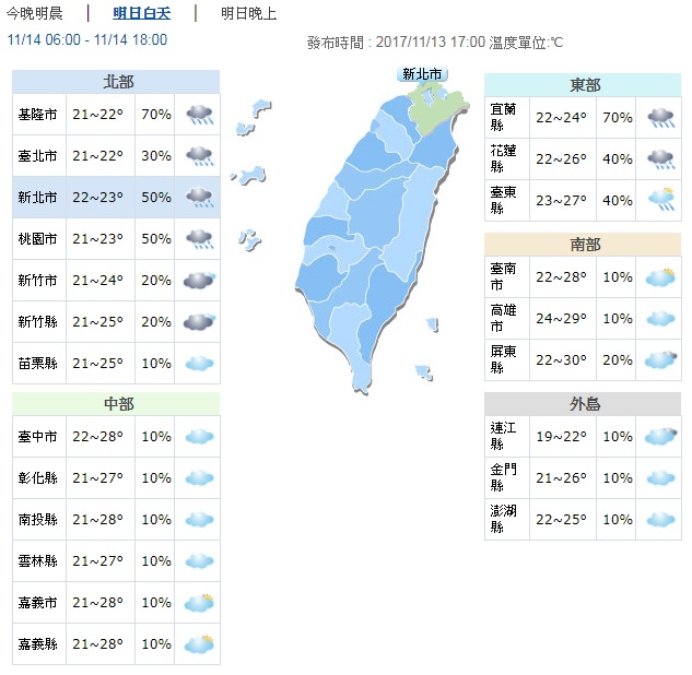 ▼明天11月14日全台天氣概況。圖/中央氣象局